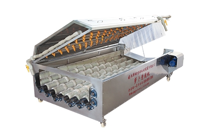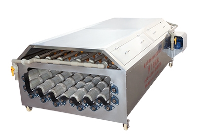 雙傾斜波浪式毛刷輥排列, 可以防止蘿卜清洗時堆積邊槽, 從而影響蘿卜頂部預(yù)留莖葉脫落或擠壓損傷。